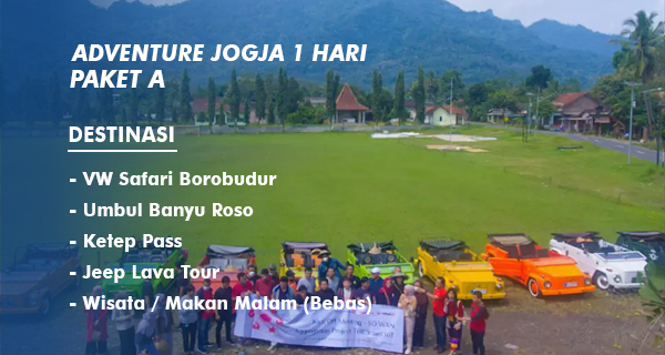 Ingin liburan sehari yang penuh tantangan dan pengalaman seru? Paket Adventure Tour Jogja 1 Hari (Paket A) siap memberikan kamu kombinasi wisata alam, budaya, sekaligus petualangan ekstrem. Dalam sehari penuh, kamu akan diajak menyusuri desa wisata dengan mobil VW klasik, berendam di mata air alami, menikmati panorama Merapi dari ketinggian, hingga merasakan serunya offroad dengan Jeep Lava Tour.